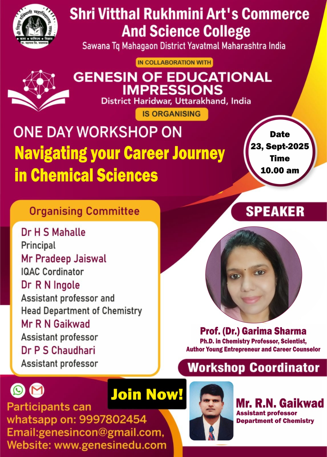 Shri Vitthal Rukmini Art’s Commerce And Science College in Maharashtra, along with Genesin of Educational Impressions, India, is hosting a one-day online workshop on Navigating Your Career Journey in Chemical Sciences on September 23, 2025, at 10 am IST.